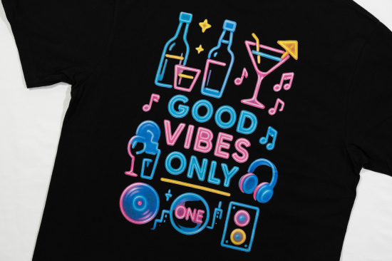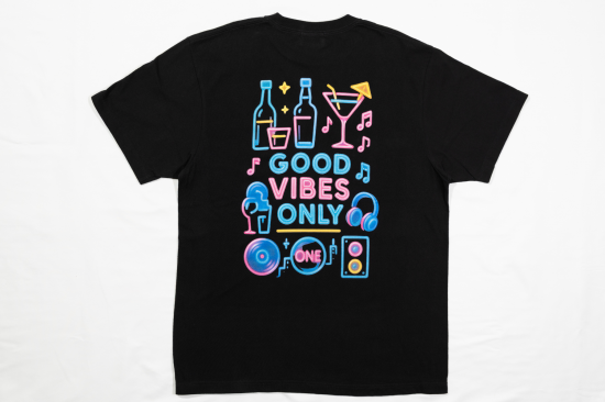 バックにBARやクラブをイメージしたネオンを大胆にプリントしました。夜の遊び場に映えるオシャレなバックプリントが最高!